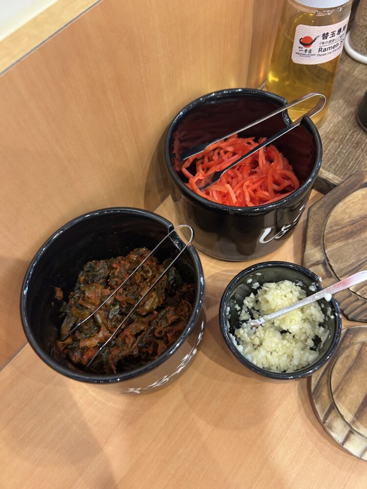 トッピングはニンニクに辛子高菜、炒り胡麻など充実しています。