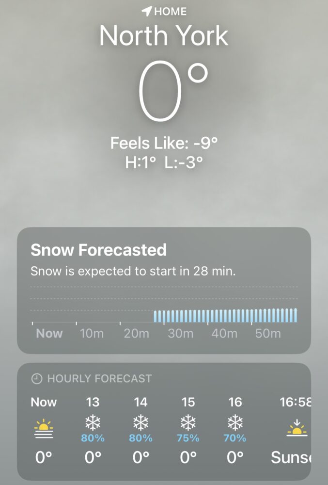 天気アプリを見ると、気温は 0℃。しかしその横には、“Feels Like: -9℃” と表示されています。