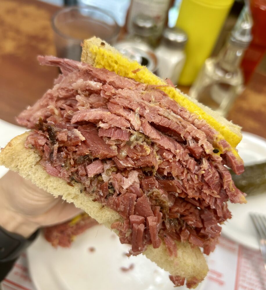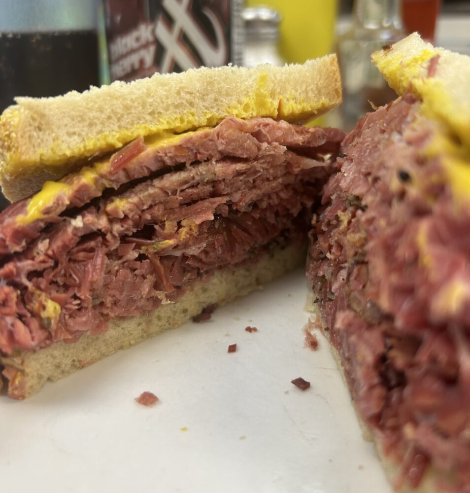 ライ麦パンの間に、薄くスライスされた燻製ビーフが何層にも重なり、見るからに肉々しい迫力です。