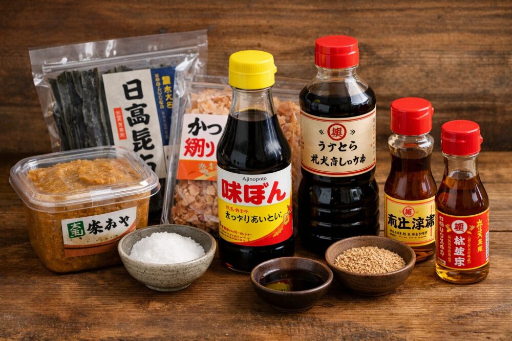 次に紹介したいのが、日本の調味料です。私が持ち帰ったのは、味噌汁、出汁、味ぽんなど、日本の食卓に欠かせないもの。