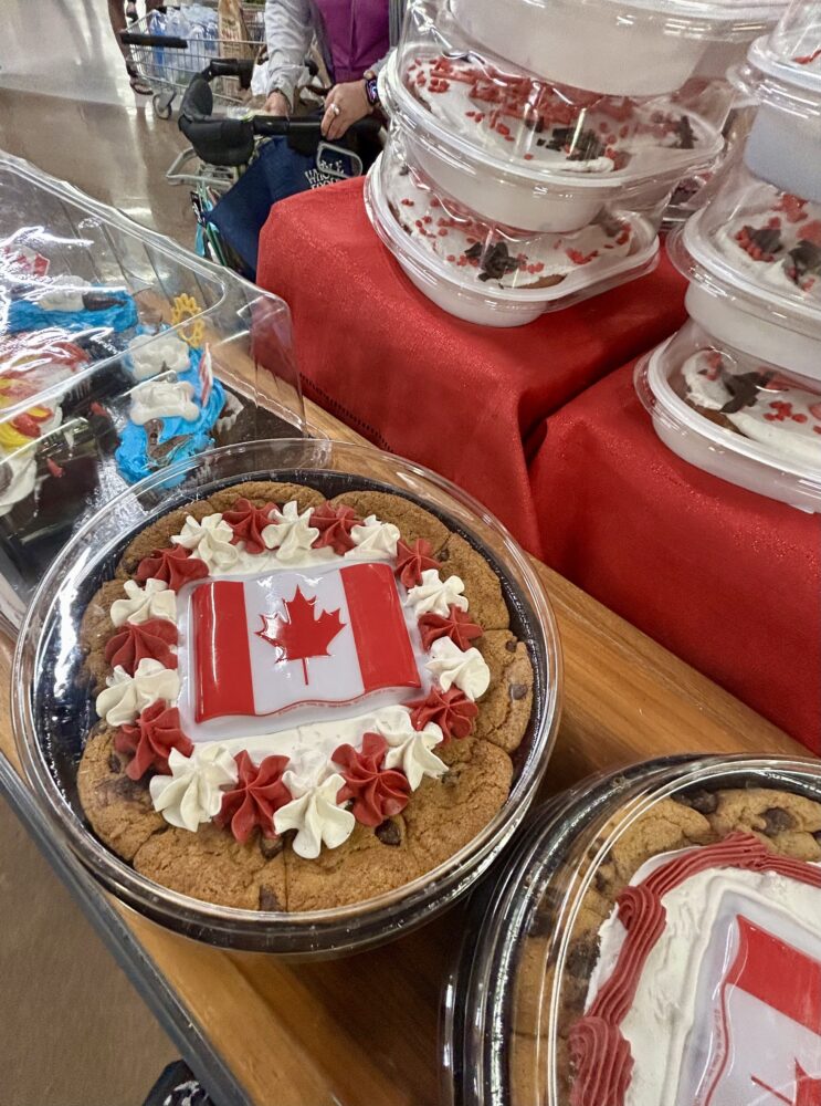 カナダのスーパーではイベントごとに特別なケーキが登場します。特に カナダデーにはオリジナルケーキが並び、国旗デザインや「Happy Canada Day」と書かれた華やかなケーキが一面に見られます。