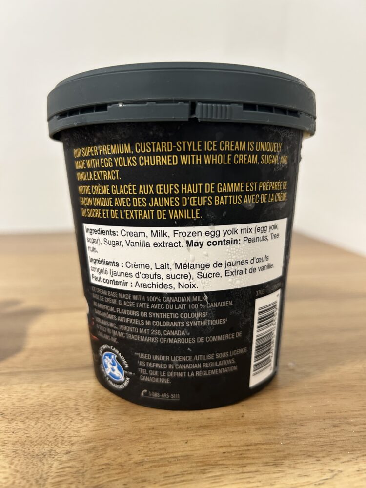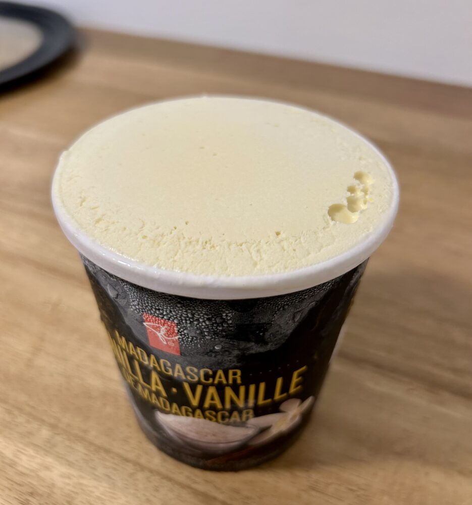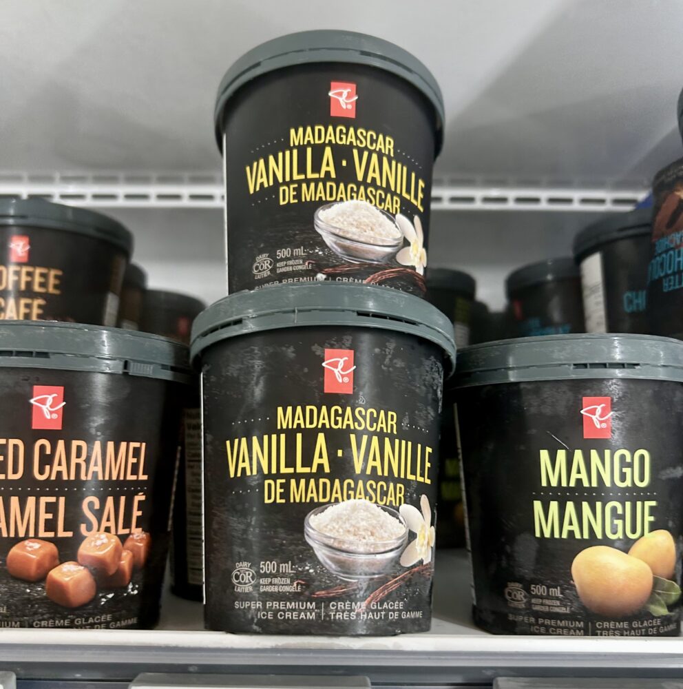 今回は、ずっと気になっていた President’s Choice(PC)ブランドの「Madagascar Vanilla」アイスクリーム を購入してみました。価格は500mlで $4.99。カナダの物価を考えると手頃な値段で、他のフレーバー(チョコレート、ストロベリー、キャラメル、マンゴーなど)と一緒に陳列されていました。