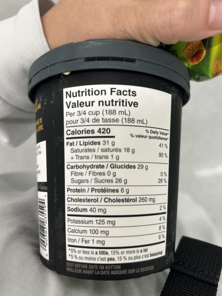 日本のコンビニやスーパーでは個包装のカップやバータイプが主流ですが、カナダでは500mlや2Lといった大容量パッケージが一般的。家族や友人とシェアする文化が表れているように感じます。