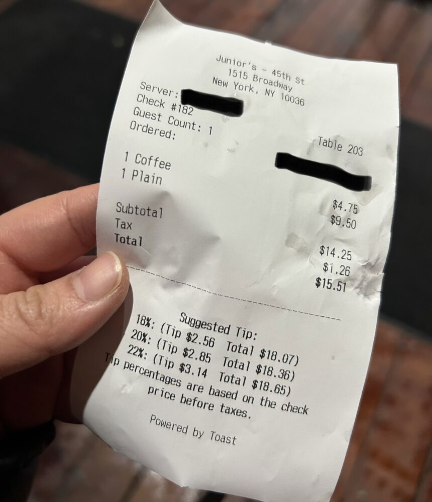 で、合計約$18。正直「高すぎる…!」という気持ちは否めません。ただ、タイムズスクエア×ホリデーシーズンという立地と時期を考えると、ある意味“ニューヨーク価格”。観光体験込みと割り切るのが現実的です。