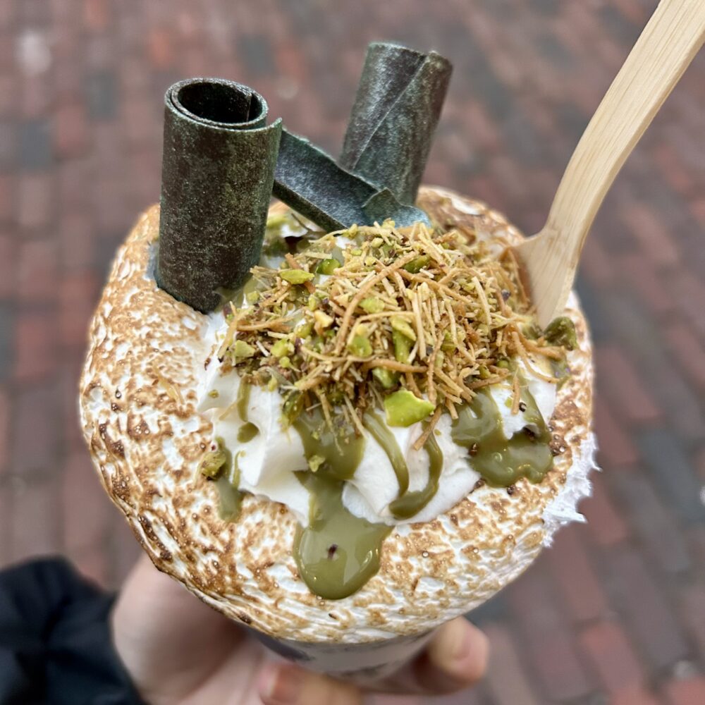 ピスタチオホットチョコレートをベースに、カダイフ、トーストマシュマロ、ピスタチオチョコレートバークが豪華にトッピングされた映え系ドリンクです。