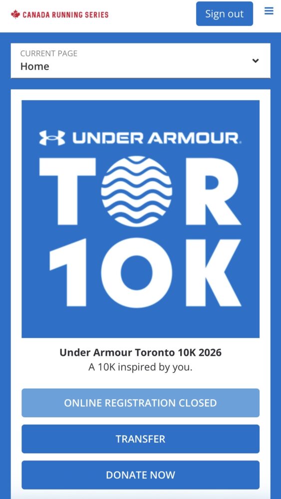 Toronto 10Kは、Canada Running Seriesの公式サイトからオンラインで申し込みできます。エントリーページで名前・連絡先・緊急連絡先・Tシャツサイズなどを入力し、支払いを済ませれば登録完了です。